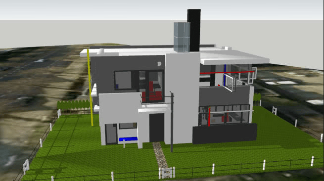 The clearest way to distill de stijl is to examine its ideas made evident in painting, sculpture, graphic design, and, most significantly, architecture. In 1924 voltooide rietveld het schröderhuis. Deze villa was vernieuwend voor de architectuur en onderscheidde zich van andere stijlen door asymmetrie en het gebruik van rechthoeken en onversierde vormen die met strakke precisie hun plaats hadden gekregen.