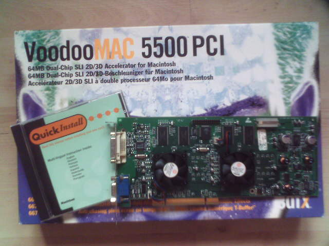 Ich verkaufe eine originale 3dfx voodoo5 5500 agp grafikkarte inkl ovp, siehe bilder. . 350euro), eine stolzes sümmchen für 2gpus die auf je 32mb ram zurückgreifen.